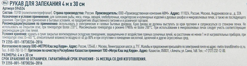 | Комплектация | рукав для запекания 1 шт. 30x400см |