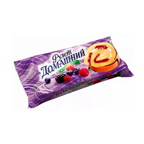 Бисквитный рулет с фруктово-ягодной начинкой, декорированный шоколадной глазурью.