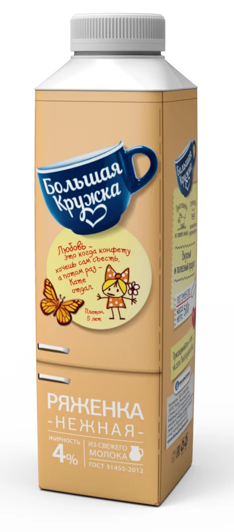 Ряженка Большая кружка - кисломолочный продукт, приготавливаемый по классической технологии из топленого молока и живой закваски. Традиционная жирность составляет 4%, продукт обладает очень мягким и нежным вкусом. Не содержит антибиотиков, консервантов и растительных жиров. Натуральный продукт для всей семьи.