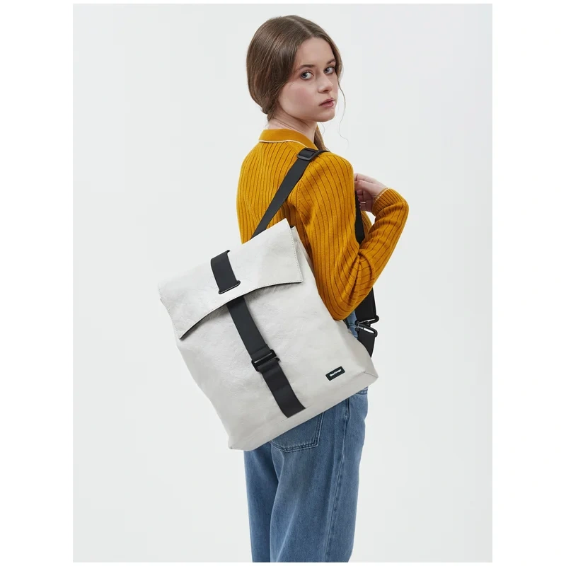 Рюкзак выполнен из высокопрочного водонепроницаемого материала Tyvek, внешне напоминающего дизайнерскую бумагу. Стильные пастельные цвета придают особый шарм данной модели.