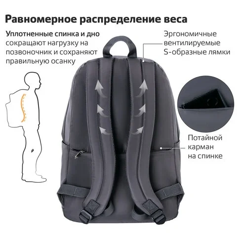 Укрепленная спинка рюкзака и эргономичные регулируемые плечевые ремни анатомической формы, оснащенные пропускающей воздух набивной подкладкой, обеспечивают максимальный комфорт при ношении рюкзака.