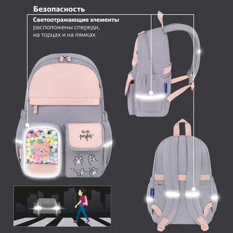 Рюкзак BRAUBERG PASTEL с термонашивками в комплекте, 'Sweet paws', серый, 40х29х14 см, 272064