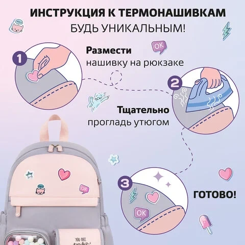 Термонашивки в подарок! Возможность создать свой неповторимый дизайн: просто размести термонашивки на рюкзаке и тщательно прогладь утюгом, работающим с паром. За несколько минут можно создать уникальный образ!