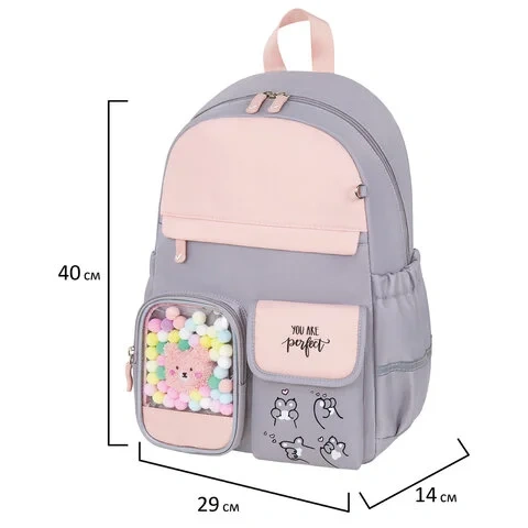В основном отделении рюкзака можно легко и быстро разместить учебники и тетради формата А4+, а также воспользоваться прижимным разделителем. Спереди рюкзака располагаются три кармана для различных мелочей: прозрачный карман с ярким декоративным наполнением, карман на липучке и большой карман на молнии. Такая структура отделений рюкзака поможет ребенку грамотно разместить в нем школьные принадлежности и личные вещи.