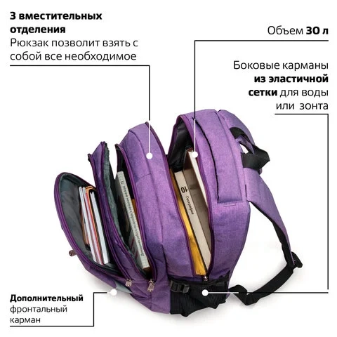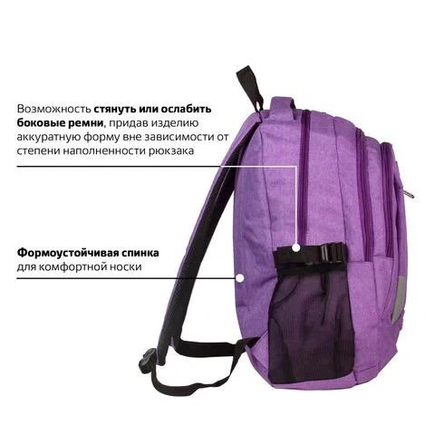 Удобный и надежный рюкзак BRAUBERG имеет оптимальную функциональную организацию – 3 вместительных отделения, боковые карманы и наружный карман для быстрого доступа к необходимым вещам.