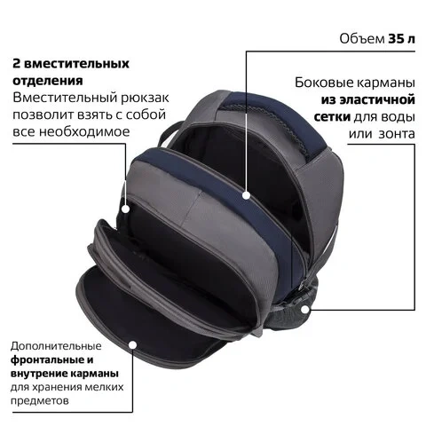 Рюкзак имеет оптимальную функциональную организацию: два больших отделения, боковые карманы, большой наружный карман и фронтальные карманы для быстрого доступа к необходимым вещам.