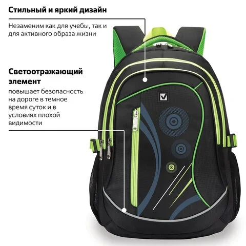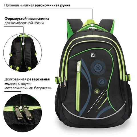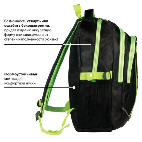 Удобный и надежный рюкзак BRAUBERG имеет оптимальную функциональную организацию – три вместительных отделения, боковые карманы и наружный карман для быстрого доступа к необходимым вещам.