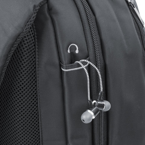 - Отверстие для вывода гарнитуры и наушников находится в верхней части рюкзака.