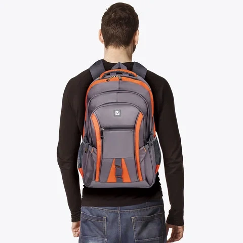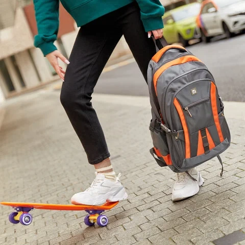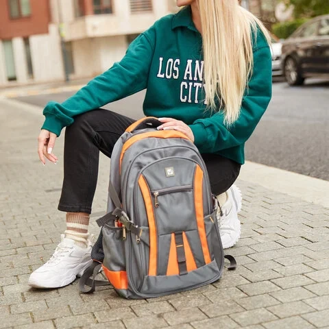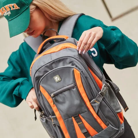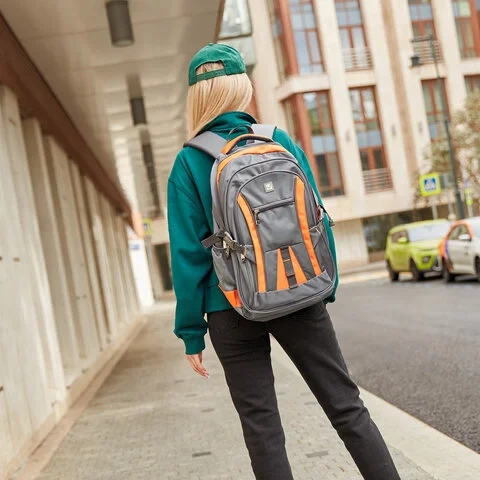 - Оригинальное сочетание серого и оранжевого цвета в дизайне рюкзака.