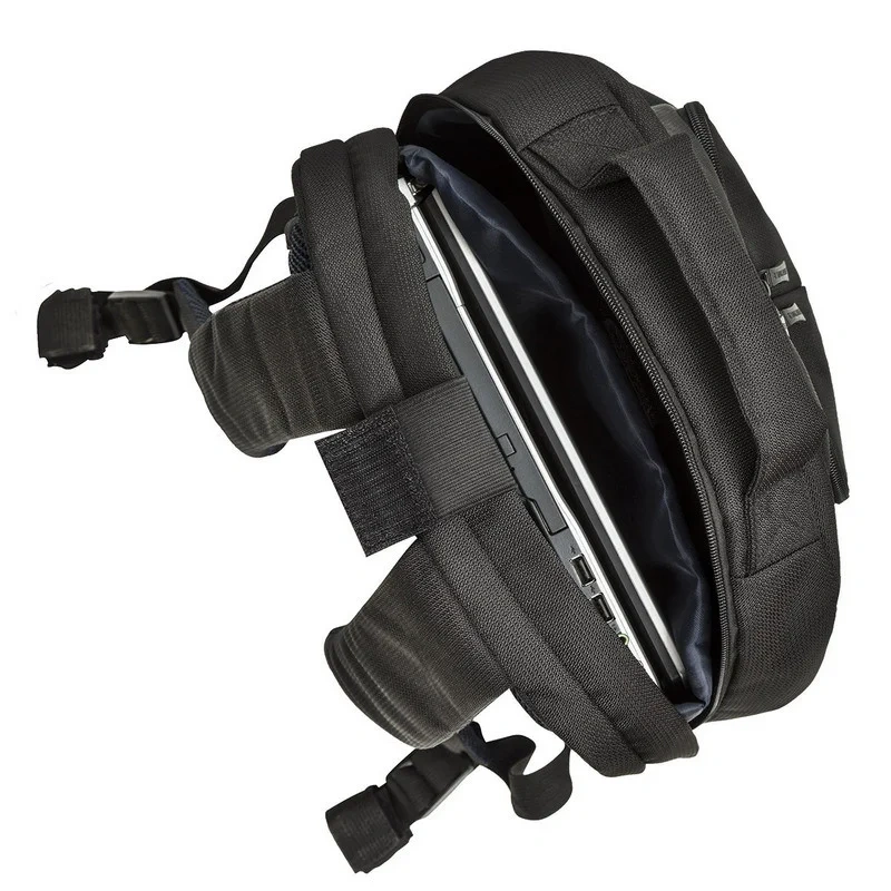 Основное отделение для ноутбука с вертикальной загрузкой, имеет мягкие стенки и ремень для надежной фиксации ноутбука до 17'.