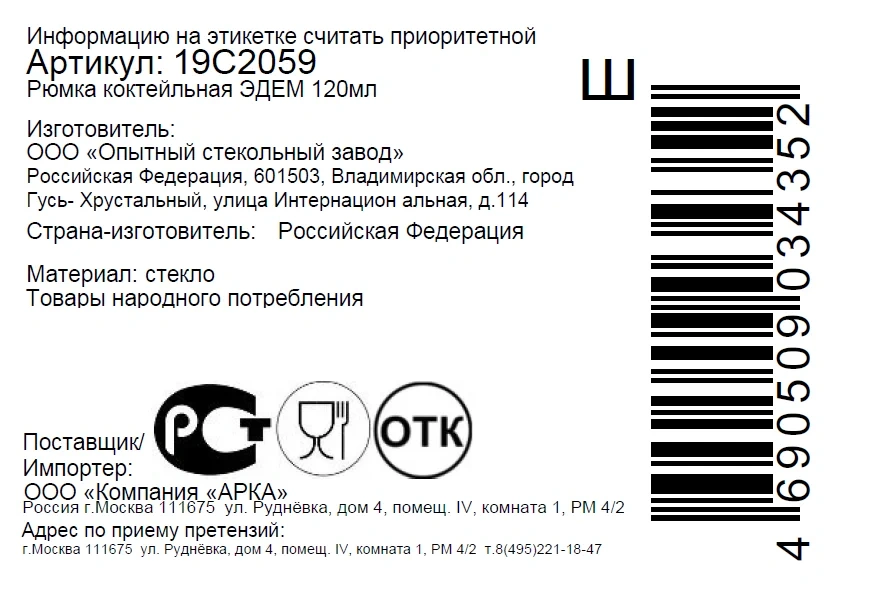 | Комплектация | рюмка коктейльная -1 шт. |