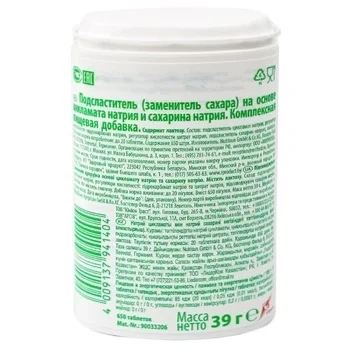 Подсластитель упакован в пластиковую емкость с крышкой-дозатором. Выпускается в форме таблеток. В од...
