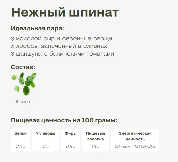 Салат Белая Дача Шпинат нежный, 50г это идеальное дополнение к вашему рациону! В эту упаковку попадают только самые молодые листики, которые бережно вырастили, собрали вручную, трижды промыли и тщательно просушили с применением современных технологий. Бэби-листочки шпината отличаются нежностью и сочностью, поэтому и блюда с ними получаются особенно вкусными и аппетитными. Шпинат – это очень полезный листовой овощ, который улучшает пищеварение, повышает эластичность сосудов, укрепляет кости, снижает риск анемии, способствует укреплению иммунитета. Листики не нарезают на производстве, благодаря чему они попадут к вам на стол максимально свежими.