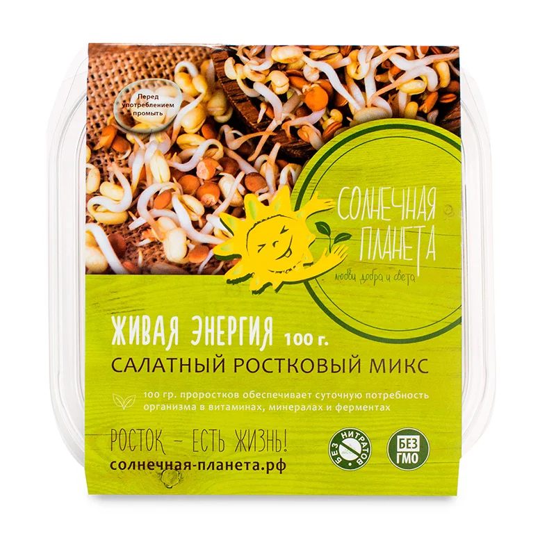 Живая энергия - это продукция бренда здорового питания Солнечная Планета, салатный микс из смеси проростков маша и чечевицы, а также подготовленных семян подсолнечника и льна. Этот продукт способен обогатить любое блюдо - салаты, супы или гарниры - повышенным содержанием витаминов, минералов и аминокислот, помочь организму справиться с токсинами и улучшить пищеварение. Упаковка в виде пластикового контейнера помогает сохранить продукт до двух недель. Перед употреблением необходимо промыть. В упаковке допускается попадание семян с дефектом формы, окраски, небольшими механическими повреждениями.