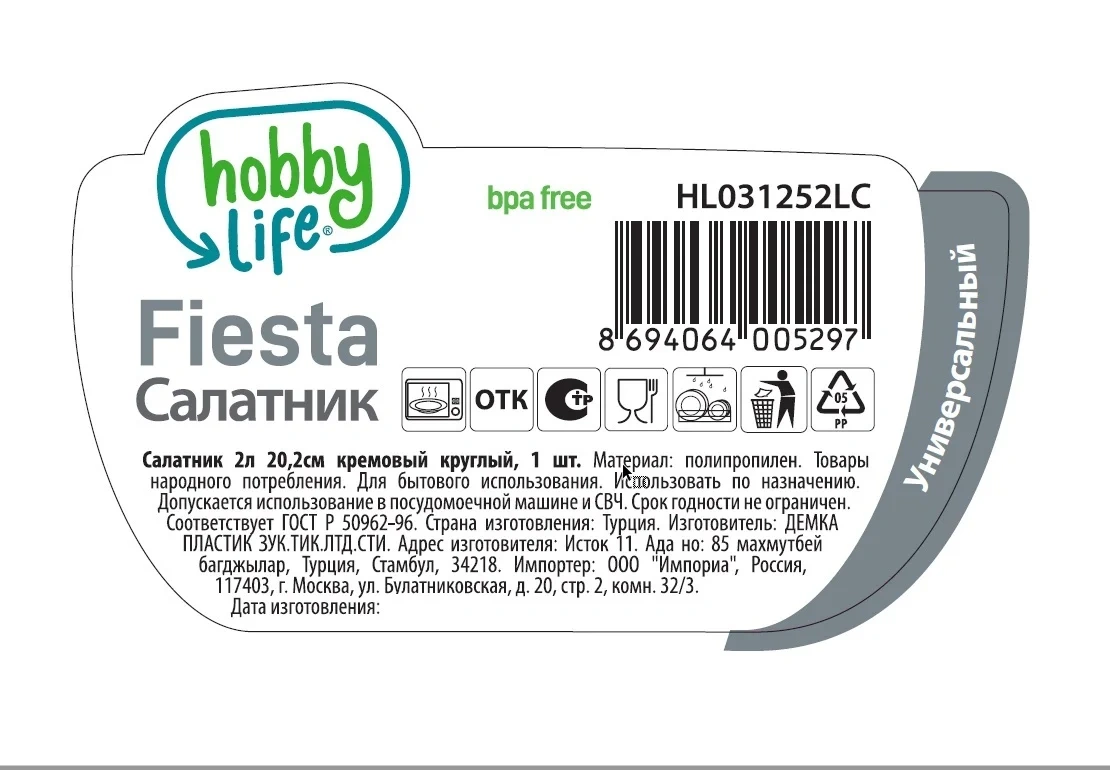 Салатник Hobby Life Fiesta круглый кремовый, 2 л станет неотъемлемым элементом сервировки стола. Посуда долговечная и практичная, она подойдет для подачи различных блюд: салатов, фруктовых десертов. Даже обычный продукт будет смотреться в такой посуде празднично. Такая посуда не впитывает внешние запахи, а также выдерживает температурные перепады. Она без затруднений очищается даже от застарелых загрязнений под проточной водой с мягкой губкой и жидким моющим средством. Перед хранением изделие рекомендуется тщательно просушить полотенцем. Чтобы исключить появление следов от капель или разводов, поверхность желательно просушить полотенцем или бумажной салфеткой.