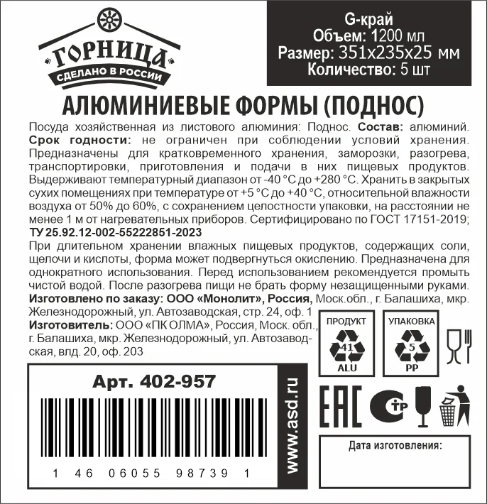 Форма Горница поднос с G-краем 1.2л 351 x 235 x 25мм, 5шт