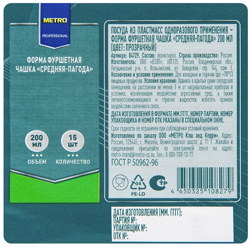Форма для фуршета Metro Professional 200мл, 15шт/уп