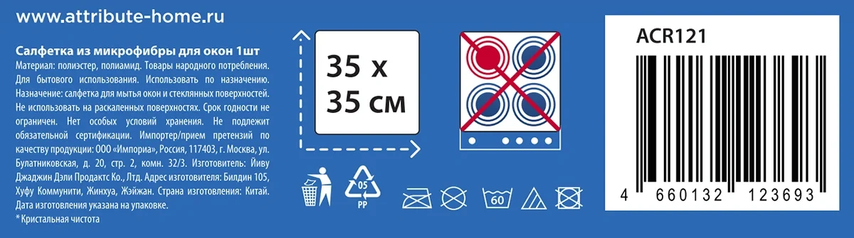 Салфетка Attribute для окон микрофибра, 35 x 35см