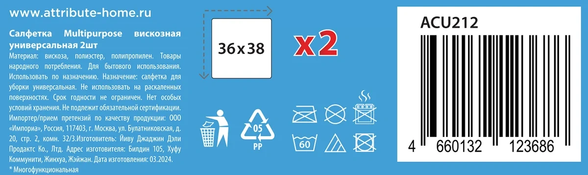 Салфетка Attribute Multipurpose универсальная вискоза 2шт, 36 x 38см