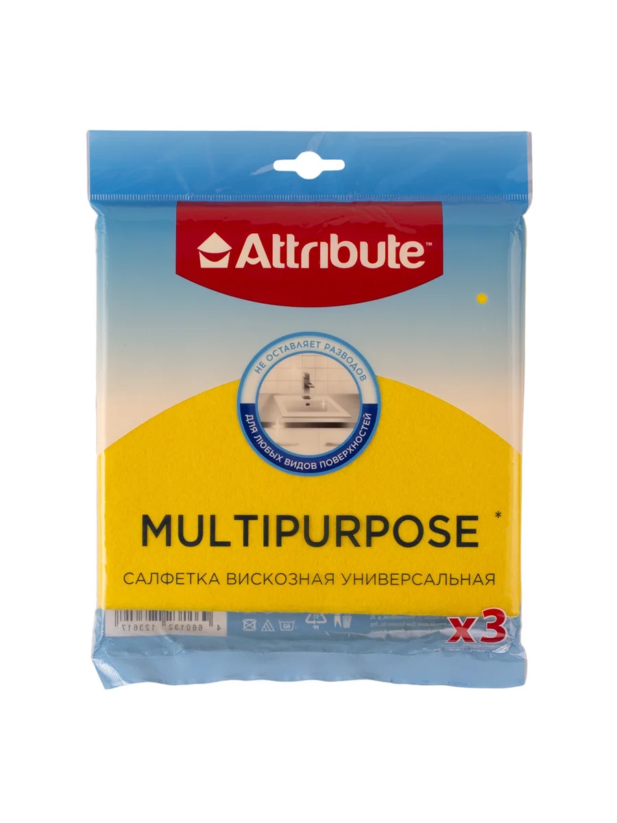 Салфетка Attribute Multipurpose универсальная вискоза 3шт, 36 x 38см превосходно впитывает, обладает устойчивостью к растворителям. Не оставляет ворсинок на поверхности.Салфетка подходит для влажной уборки любых поверхностей: она легко удаляет любые загрязнения без применения моющих средств. Особенно хорошо убирает зеркальные поверхности и сантехнику (краны, смесители). Для использования просто намочите и отожмите салфетку, протрите поверхность и дайте ей высохнуть. Можно стирать в стиральной машине при низких температурах, не добавлять кондиционер, не сушить на батарее.