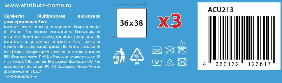 Салфетка Attribute Multipurpose универсальная вискоза 3шт, 36 x 38см