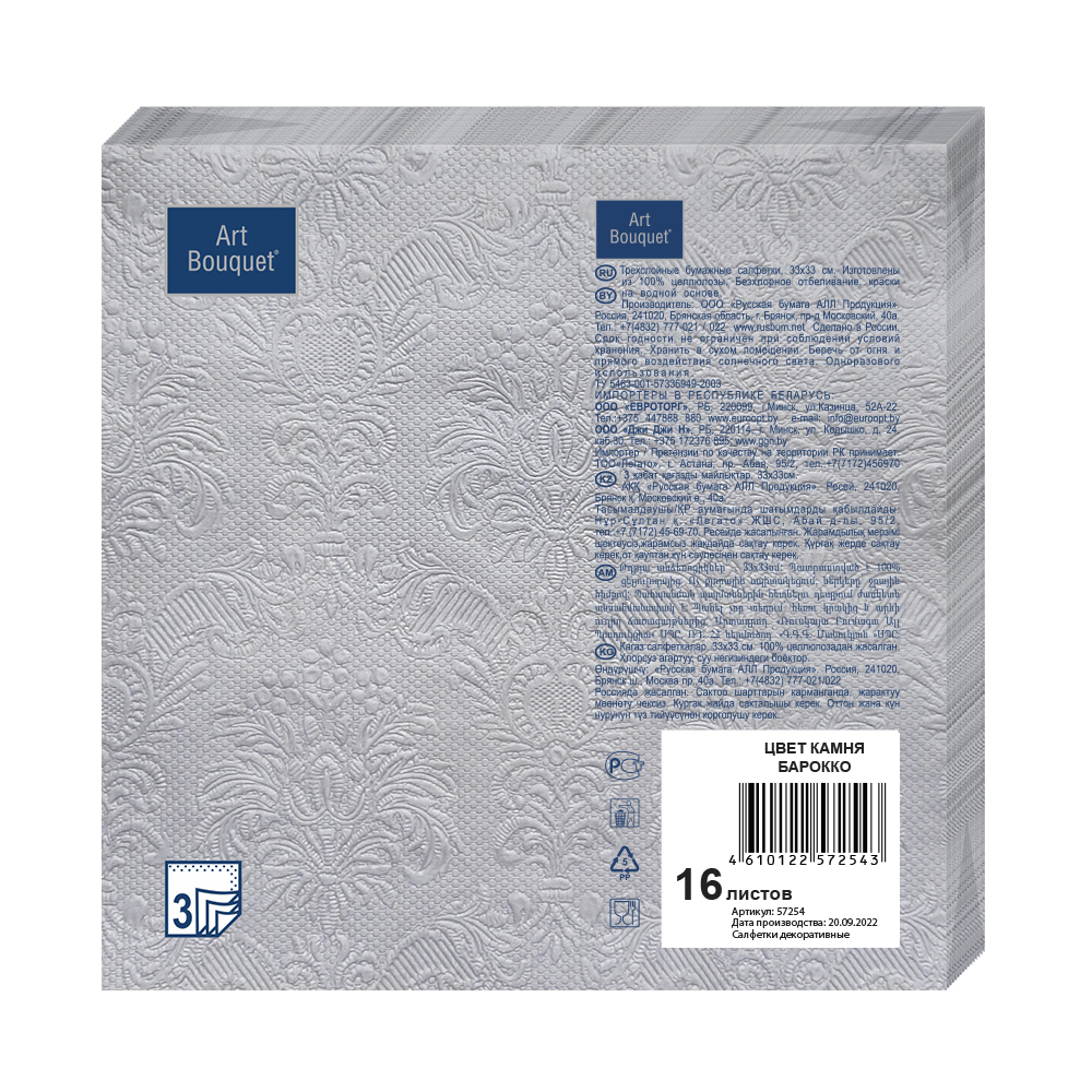 Салфетка Bouquet Цвет камня барокко 3 слоя, 16шт деликатно и нежно высушивают кожу рук. Они отличаются высокой впитываемостью, поэтому быстро поглощают влагу. Салфетки можно разместить в кафе, ресторанах и других заведениях общественного питания, дома. Также их можно использовать в административных и офисных зданиях, салонах красоты и парикмахерских. Одной пачки хватает на длительное время даже при постоянном использовании. Салфетки мягкие, объемные и экономичные — одного листа достаточно, чтобы вытереть ладони. Bouquet — российский бренд. Он принадлежит ООО Русская бумага АЛЛ Продукция. Компания была основана более 20 лет назад. С тех пор ассортимент продукции значительно расширился. В нем представлены одно-, двух- и трехслойные салфетки из целлюлозы, крафт-бумаги. Для нанесения рисунков используются высококачественные и безопасные краски. Разработано более 500 различных дизайнов салфеток, которые украсят повседневный и праздничный стол. На официальном сайте компании регулярно обновляются каталоги, а на производстве задействовано современное и технологичное оборудование.