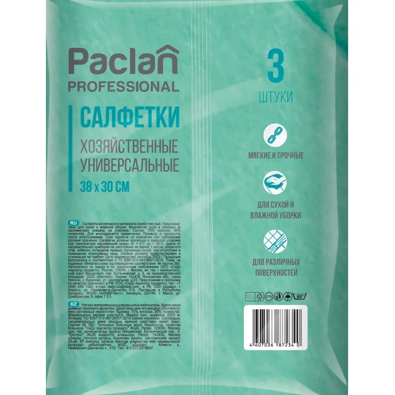 Салфетка хозяйственная Paclan Professional универсальная, 38х30см, вискоза, 3шт/уп
