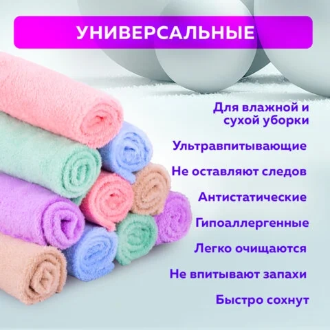 Отлично впитывает влагу, масло, грязь. Не оставляет разводов и ворса. Не царапает деликатные поверхности, такие как экраны и ЖК-мониторы, стекло, полированную мебель. Плотность 250 г/м2 обеспечивает высокую износостойкость и экономичный расход. Размер - 30х30 см. Сохраняет свои свойства даже при многократном применении. В комплект входит 20 салфеток. Цвета в комплекте: синий, фиолетовый, розовый, зеленый, коричневый.