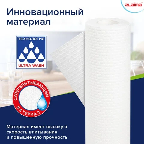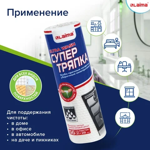 Салфетка рулонная Laima Супер Тряпка 21х28см, целлюлозные, многоразовые особо прочные, 56 шт/уп