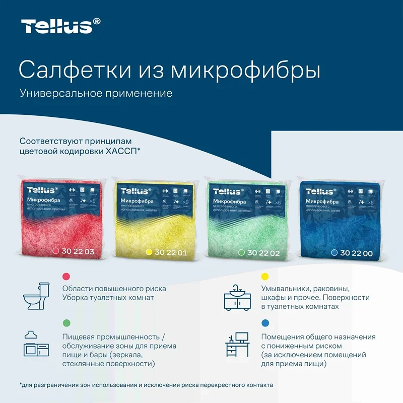 Салфетки Tellus из микрофибры представлены в четырех основных цветах, соответствующих принципам цветовой кодировки в рамках системы безопасности ХАССП: синие (арт. 302200), желтые (арт. 302201), зеленые (арт. 302202), красные (арт. 302203). Благодаря этому салфетки могут использоваться не только для уборки офисов, но и в сферах HoReCa, а также производствах, где необходимо контролировать уборку различных зон и поверхностей и разных типов загрязнений для снижения риска перекрестного контакта. С помощью салфеток Tellus можно очищать такие чувствительные поверхности, как оконные стекла, зеркала, мониторы, оптику, зоны кухни и туалетной комнаты.