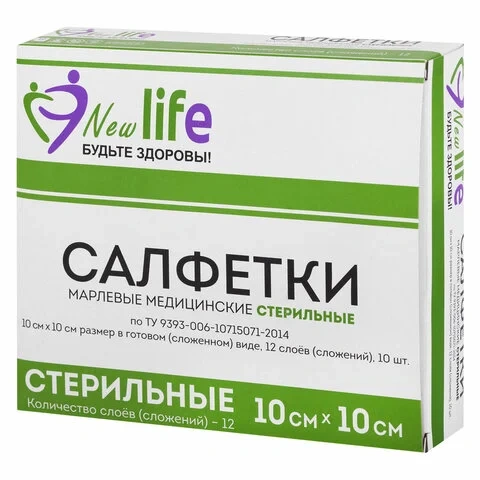Салфетка марлевая стерильная NEW LIFE КОМПЛЕКТ 10 шт., 12 слоев, 10х10 см, плотность 36 (±2) г/м2, 1