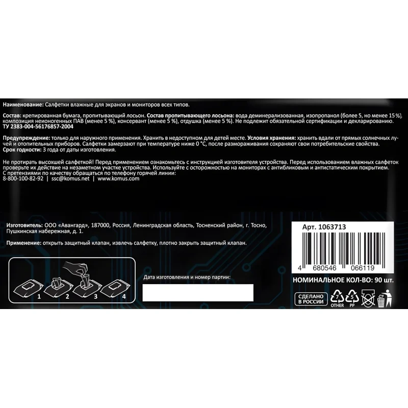 Меры предосторожности: Перед применением ознакомьтесь с инструкцией производителя устройства. Используйте с осторожностью на мониторах с антибликовым и антистатическим покрытием. После распаковки следует вытягивать салфетки из центра для вставки в крышку.