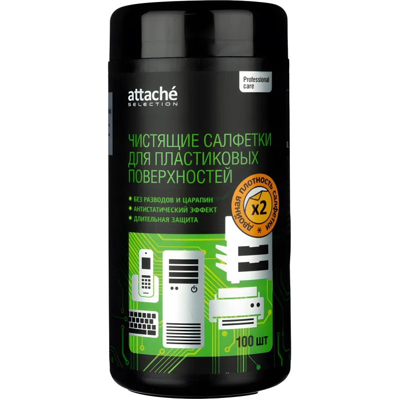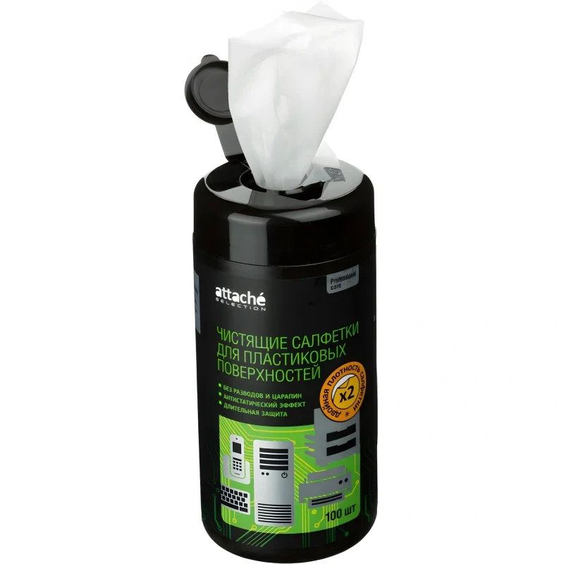 Влажные салфетки Luscan/Attache Selection изготовлены из крепированной бумаги повышенной плотности, предназначены для очистки пластиковых поверхностей техники — системных блоков, компьютеров, корпусов мониторов, клавиатур, мышей, принтеров, МФУ,факс-аппаратов и других устройств. Не оставляют разводов и ворса, обладают длительным антистатическим эффектом. Специальный состав с активными компонентами пролонгированного действия безупречно очищает поверхности от пыли и грязи, безопасен для кожи рук. Удобная туба-диспенсер с большойкрышкой-дозатором препятствует высыханию салфеток. Салфетки изготовлены из полностью биоразлагаемого материала. Материал повышенной плотности (40 г/кв.м) более эффективно очищает поверхность, исключает вероятность обрыва салфеток при вытаскивании. Размер одной салфетки: 130×150 мм. В тубе 100 штук.