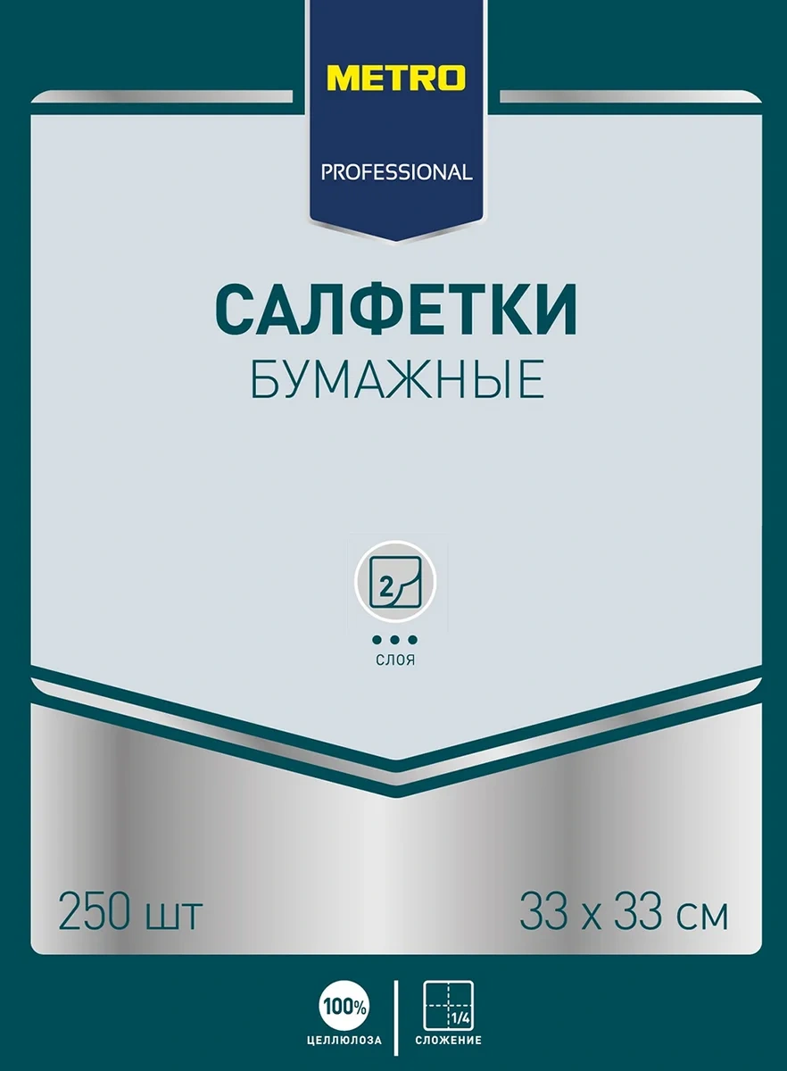 Двухслойные салфетки с 1/4 сложения выполнены из 100% целлюлозы, что обеспечивает прочность и повышенную впитываемость.