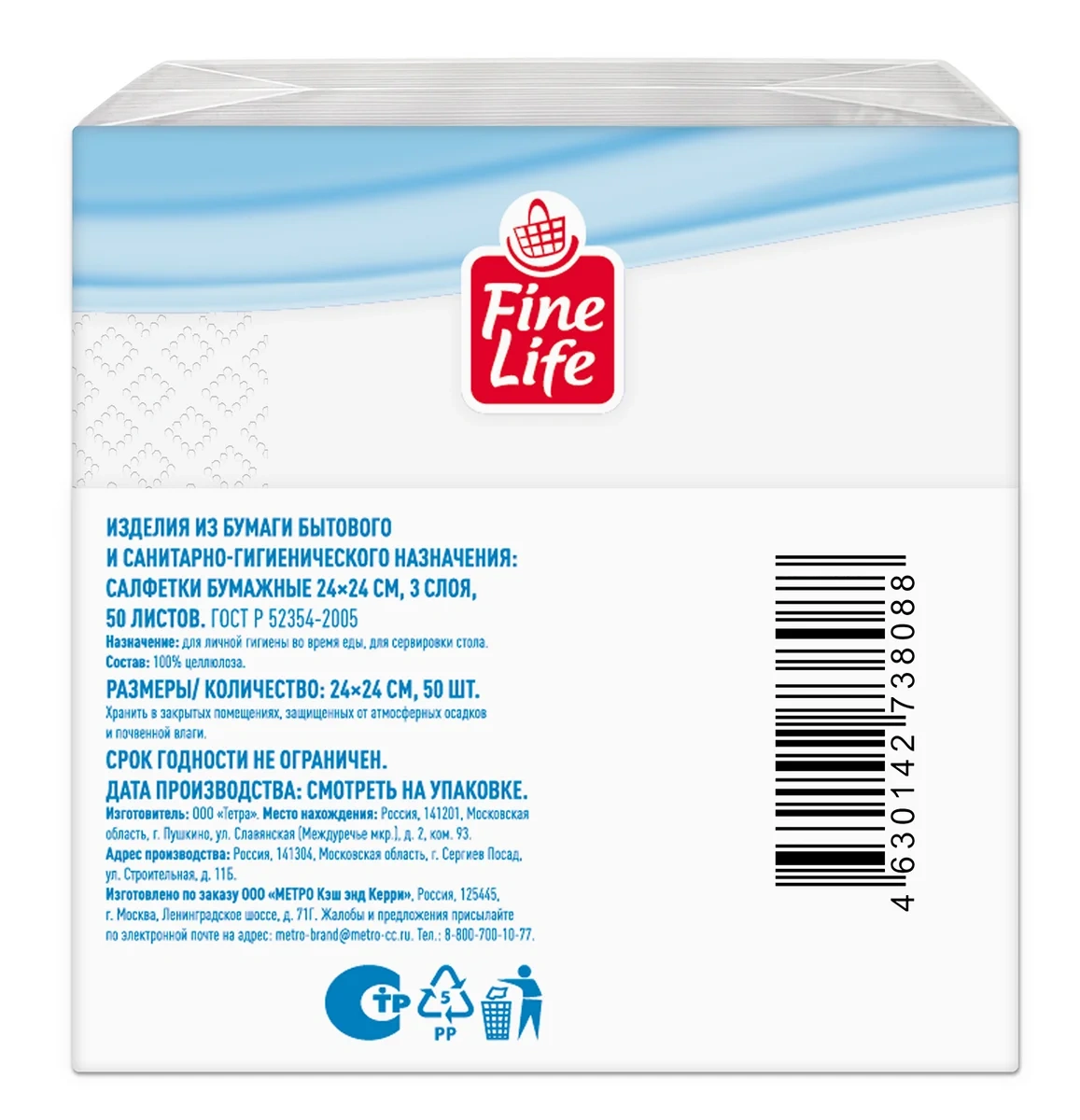 Упаковка содержит 200 салфеток размером 33х33 см.
