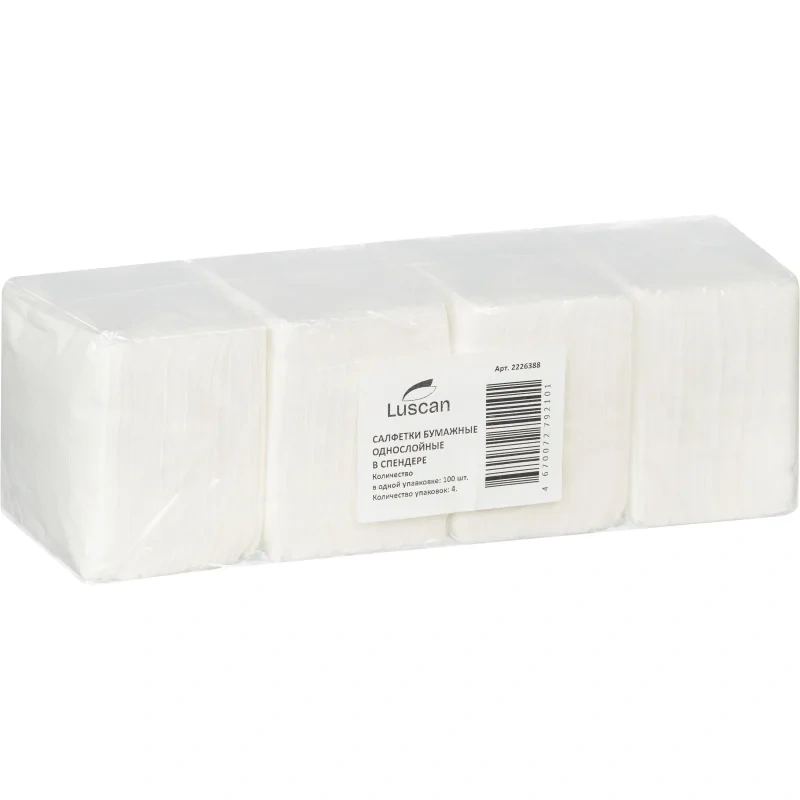 Салфетки бумажные Luscan 1-слойные 24×24 см белые (4 пачки по 100 листов+спендер)
