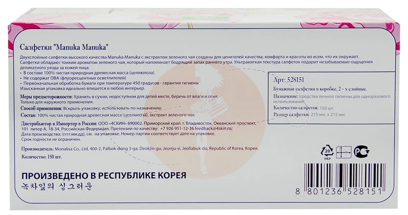 Двухслойные салфетки высокого качества Manuka Manuka с экстрактом зеленого чая созданы для ценителей качества, комфорта и красоты во всем, что их окружает. Салфетки обладают тонким ароматом зеленого чая, который напоминает бодрящий запах раннего утра. Ультрамягкая текстура салфеток подарит незабываемые ощущения деликатного ухода за кожей лица. Созданы для ценителей качества, комфорта и красоты во всем, что их окружает. Салфетки обладают тонким ароматом зеленого чая, который напоминает бодрящий запах раннего утра. Ультрамягкая текстура салфеток подарит незабываемые ощущения деликатного ухода за кожей лица.