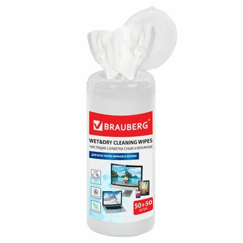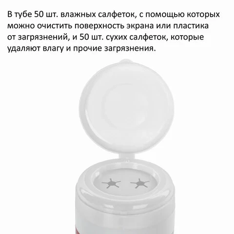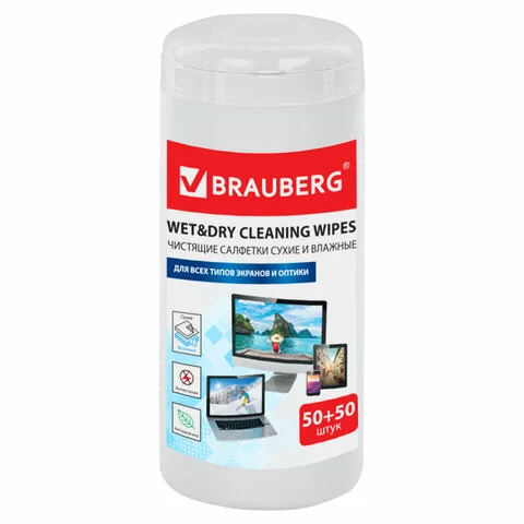 Салфетки чистящие для мониторов Brauberg Effect Clean 50 влажных+50 сухих, в тубе