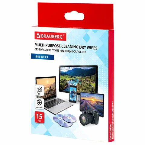 Салфетки сухие безворсовые УНИВЕРСАЛЬНЫЕ антистатичные BRAUBERG, 120х150 мм, 15 шт., 513534