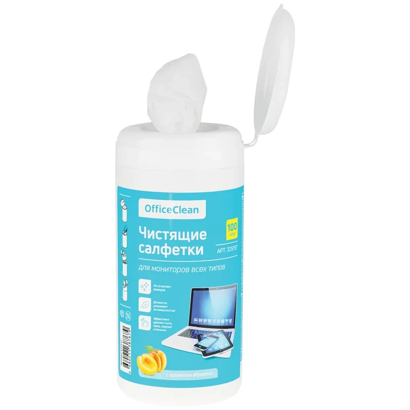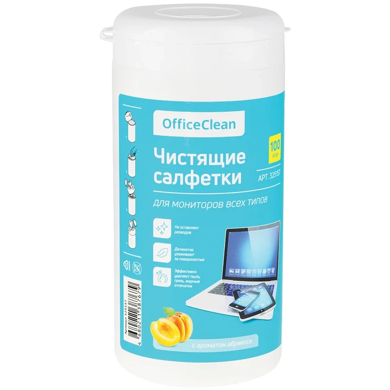 Салфетки чистящие влажные OfficeClean, для мониторов всех типов, в тубе, с ароматом абрикоса, 100шт.