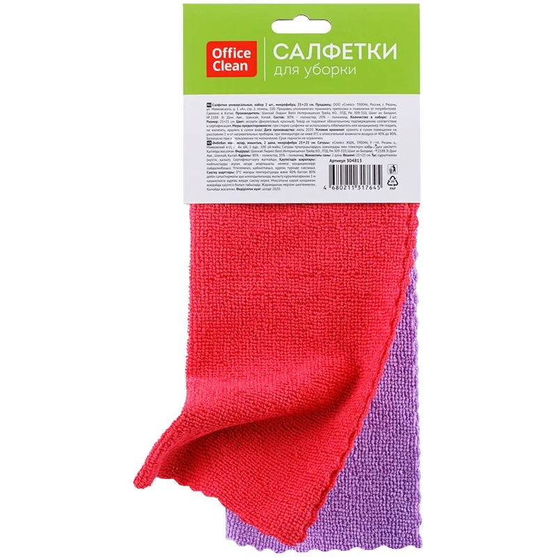Салфетки для уборки OfficeClean 'Универсальные', набор 2шт (фиолетовая+красная)., микрофибра, 25*25с