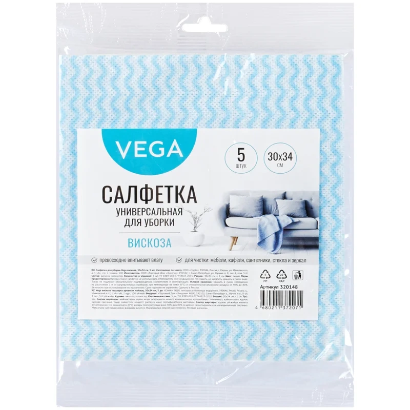 Салфетки для уборки Vega, вискоза, волна, 30*34см., 5шт.