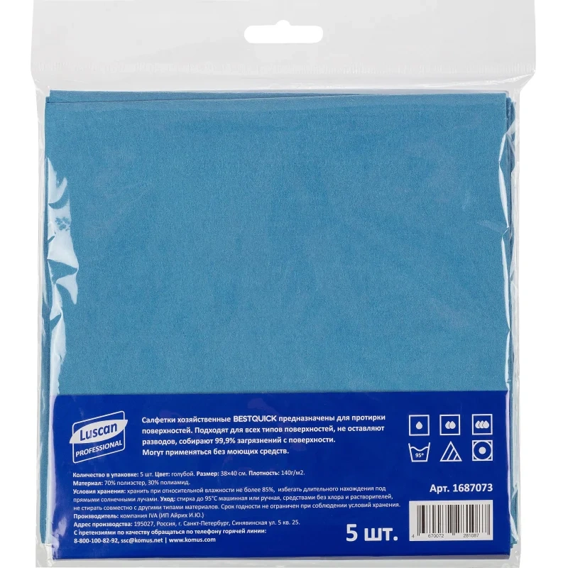 Салфетки хозяйственные Luscan Professional Bestquick микроволокно 38х40 сантиметров, 140 грамм на квадратный метр, синие (5 штук в упаковке). Хозяйственные салфетки Luscan Professional, изготовленные из микроволокна, имеют широкое применение как в быту, так и в профессиональной уборке. Салфетки удобно использовать для очищения и протирки стекол, зеркал, полированных или глянцевых поверхностей. Они отлично удаляют загрязнения, отпечатки пальцев и пыль, не оставляя разводов и ворсинок. Салфетки долговечные в использовании - до 400 машинных стирок. Характеристики: - размер: 38x40 сантиметров, - цвет: голубой, - плотность: 140 грамм на квадратный метр, - состав: 70% полиэстер, 30% полиамид, - 5 штук в упаковке.Рекомендации по уходу: машинная стирка при рекомендованной температуре 60С. Избегать хлора в процессе уборке и хлорных отбеливателей в процессе стирки.