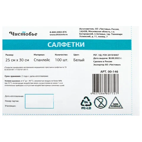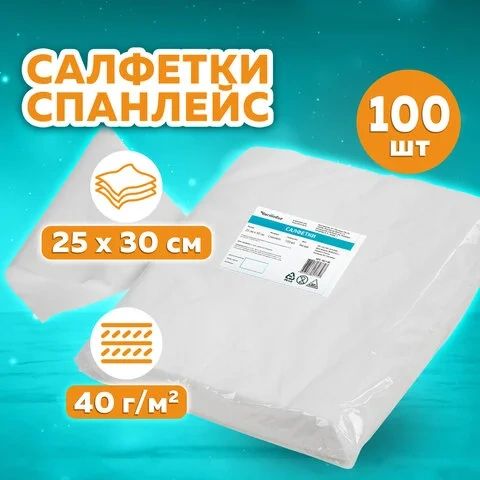 Салфетки Чистовье 25х30см, 40г/м2, 100шт, белые, спанлейс