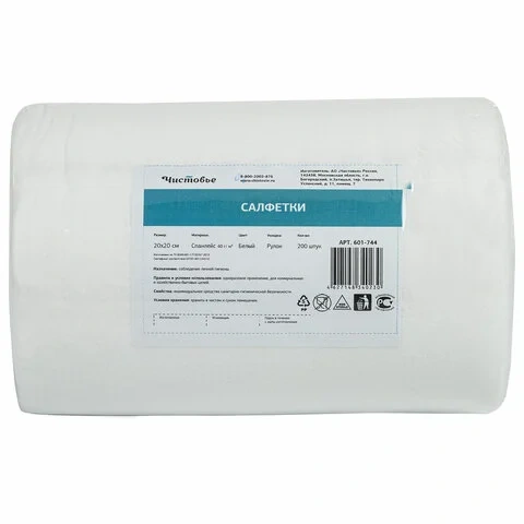 Салфетки Чистовье нестерильные 20х20см, 40г/м2, 200шт, белые, спанлейс, в рулоне
