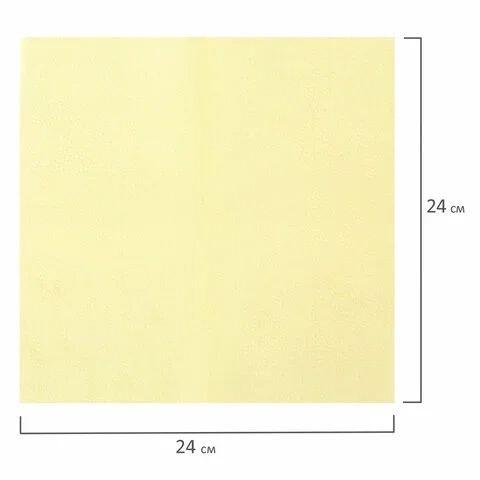 Упаковка содержит 250 салфеток размером 24х24 см. Однослойные салфетки 1/4 сложения выполнены в пастельном желтом цвете. Тиснение придает изделию привлекательный внешний вид. Изготовлены из 100% целлюлозы, что обеспечивает прочность и повышенную впитываемость.