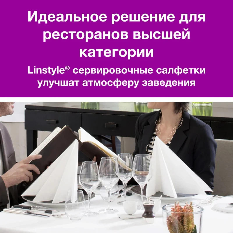 Салфетки Tork Premium LinStyle® — идеальное решение для ресторанов полного цикла обслуживания, где необходимо высокое качество, чтобы произвести хорошее впечатление на гостей. Каждая салфетка, на вид и на ощупь напоминающая настоящую ткань, заметно мягче и объемнее обычных салфеток и при этом особенно хорошо впитывает влагу. Создайте элегантную атмосферу для ваших клиентов с нашим широким ассортиментом салфеток современных и классических расцветок.