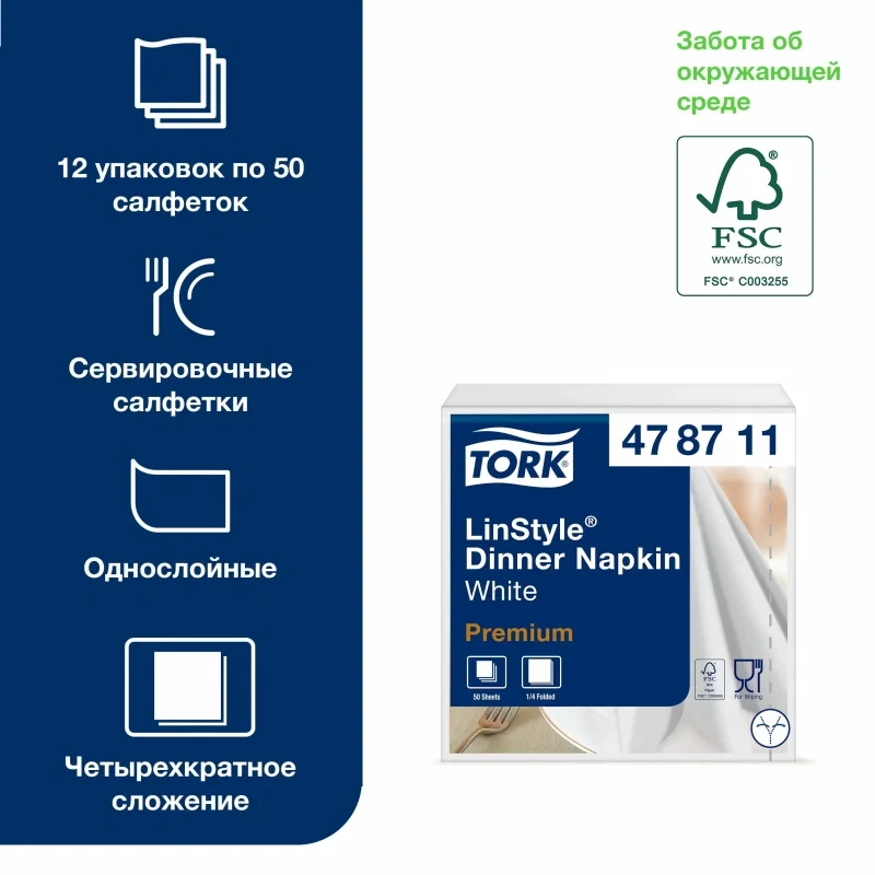 Салфетки сервировочные Tellus (tork) LinStyle 39х39см, белые, 1 слой, 50шт/уп