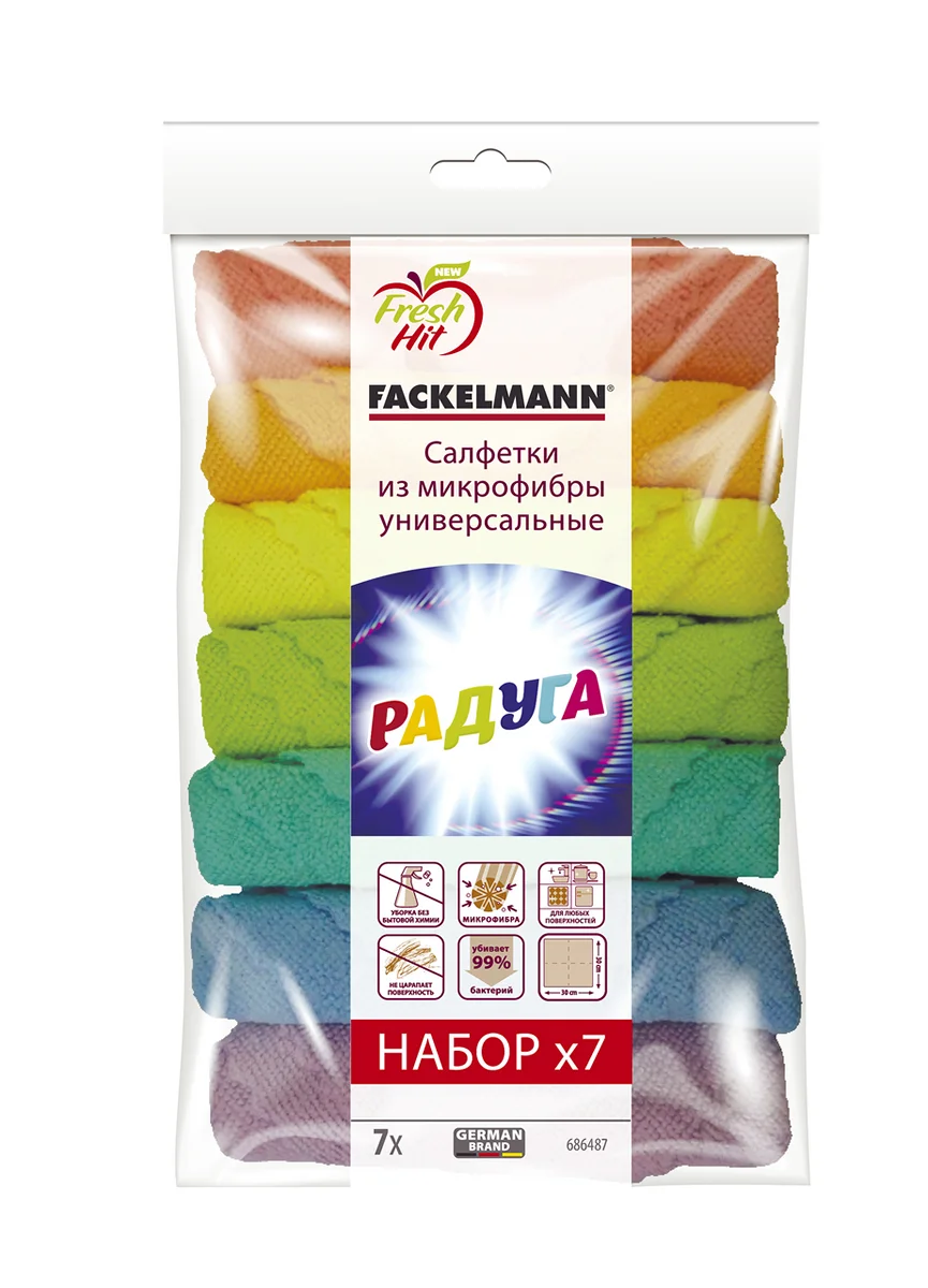 Салфетки универсальные Fackelmann Радуга из микрофибры 30 х 30 см, 7 шт. помогают легко и эффективно совершать сухую и влажную уборку на разных поверхностях. Микрофибра способна впитывать в себя большое количество влаги. Она хорошо собирает своими мелкими ворсинками частички пыли, грязи и жира, не оставляя после себя волокон. Все загрязнения удаляются деликатно, не образуя царапин. Рельефный край салфетки обработан лазером, что позволяет ей сохранять свой первоначальный внешний вид надолго. После стирки в стиральной машине она не деформируется и быстро сохнет. Их можно использовать для уборки жилых, коммерческих, бытовых помещений, а также очистки салонов автомобилей и оргтехники. Материал не линяет и после использования не оставляет разводов. Элементы комплекта способны прослужить без потери своих первоначальных характеристик не менее 3 лет. Все изделия для клининга проходят контроль качества и соответствуют современным требованиям безопасности.
