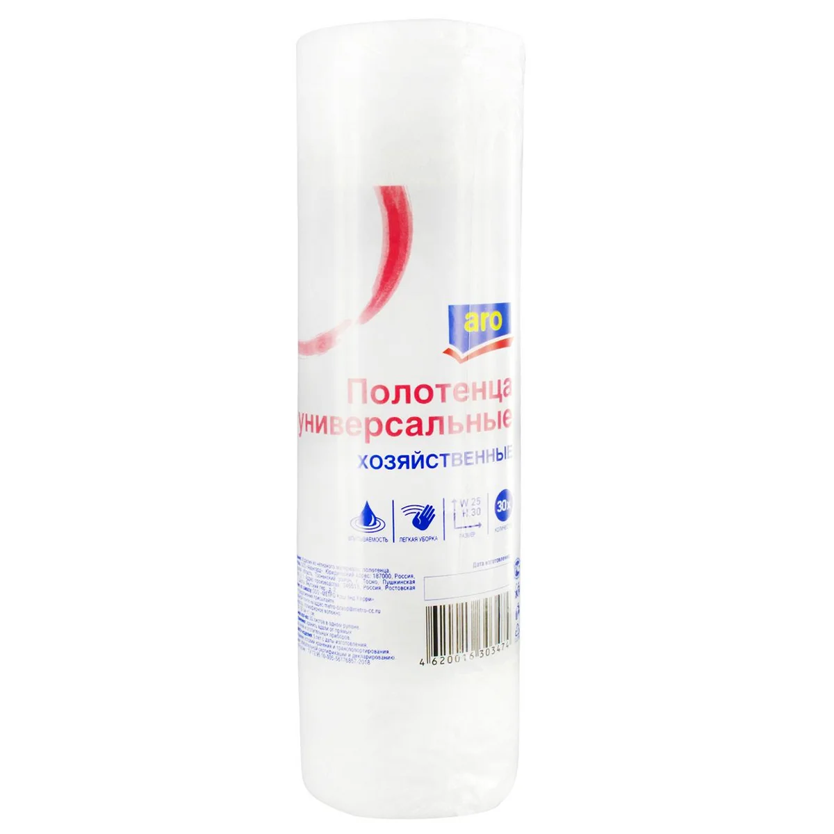 aro Полотенца универсальные хозяйственные 25 х 30см, 30шт это продукция из нетканого материала, который отличается безворсовой структурой и высокой влагопоглощающей способностью. Такие салфетки идеально подходят для кухни, ванны, туалета, офисной техники, автомобиля и многих других мест. С их помощью можно быстро и тщательно очистить поверхность любого типа, в том числе зеркала, стекла и люстры. При этом их можно использовать в паре с любыми моющими средствами. Такими салфетками можно даже отполировать мебель, предотвратив оседание на ней пыли. Немаловажно, что такие изделия не оставляют разводов и волокон. Поставляются в виде одного большого рулона, помещенного в плотную упаковку.